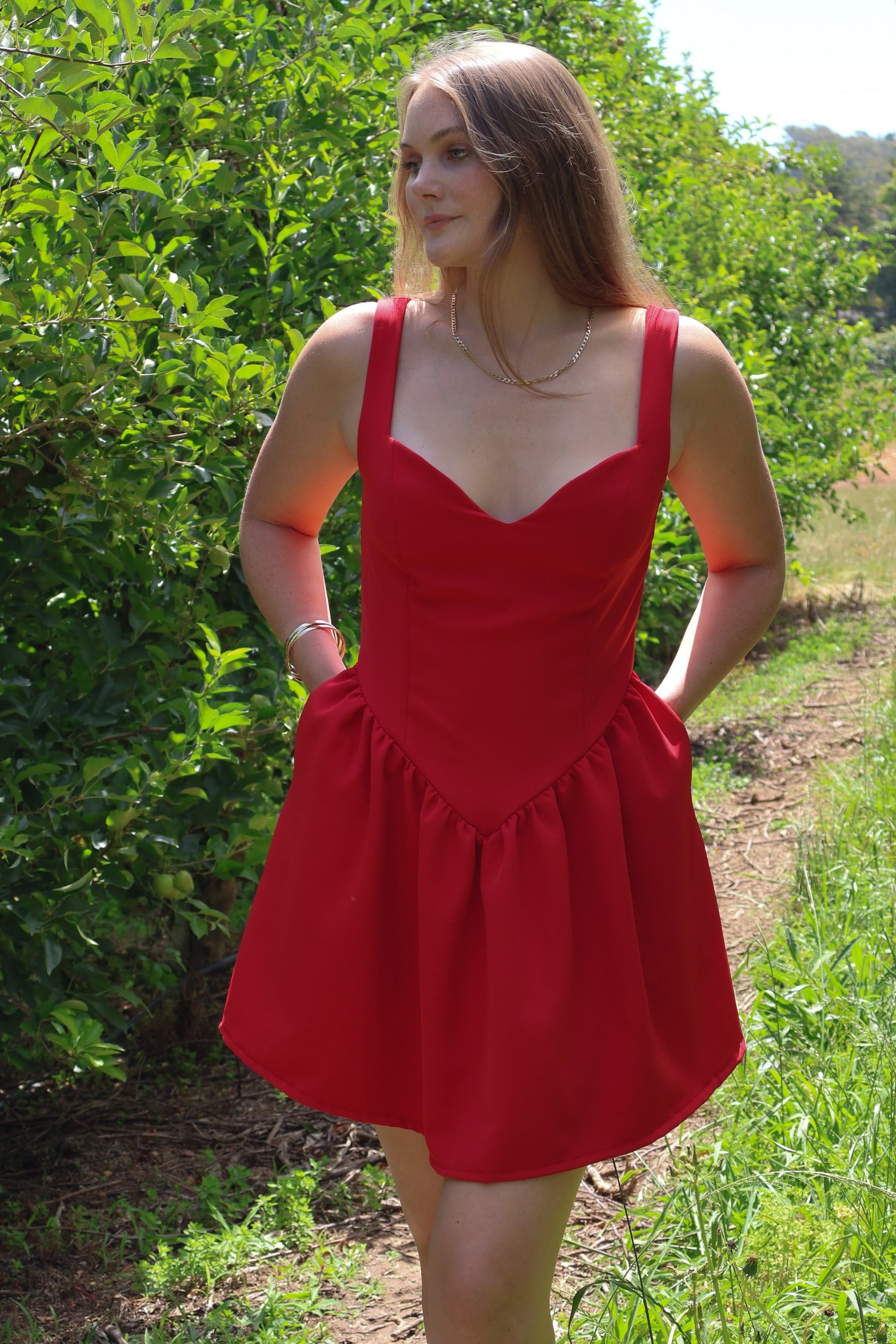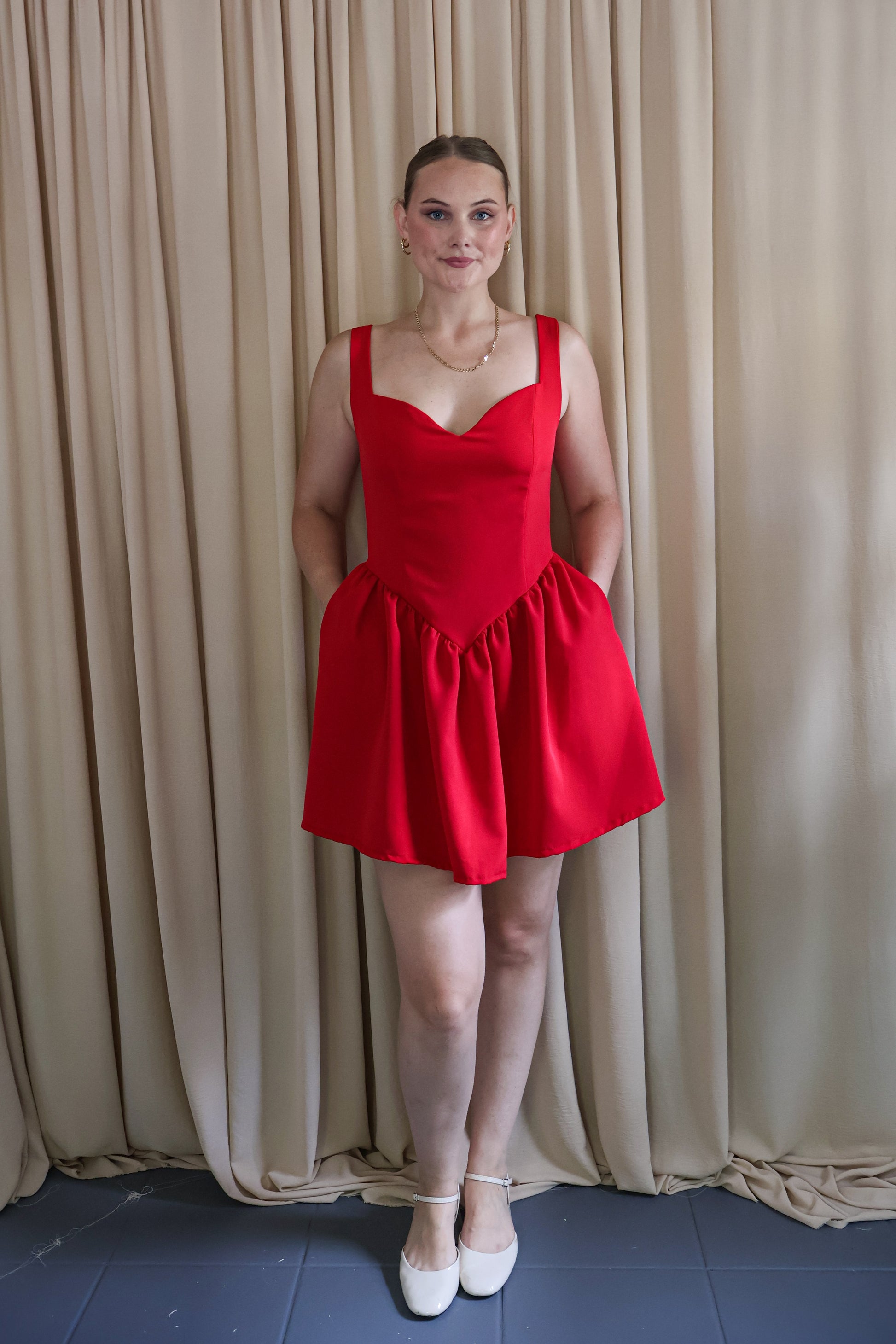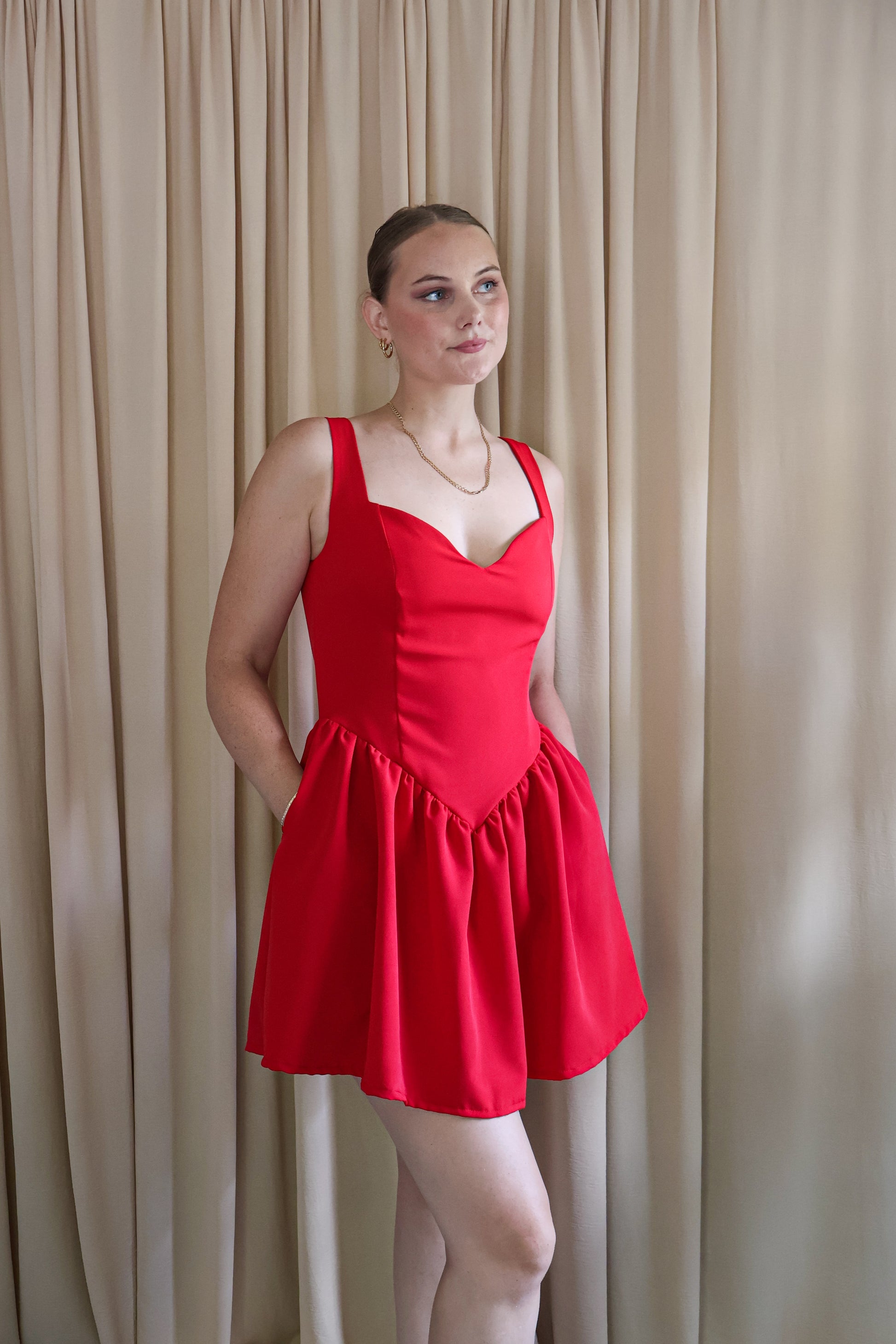 One for the red lovers to add to your core wardrobe staples. With a sweetheart neckline, drop cinched waist, and for the final touch, pockets! all crafted in a soft, lightweight cotton stretch blend for comfort and durability.